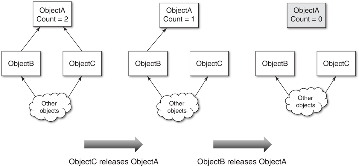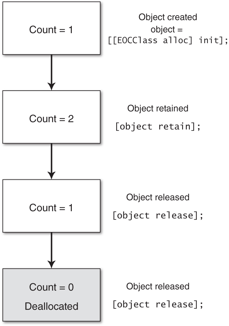 As explained previously, this code won’t compile under ARC, owing to the explicit calls to release. In Objective-C, a call to alloc will result in the return of an object that is said to be owned by the caller. That is to say, the caller’s interest has already been registered because it used alloc. However, it is important to note that this does not necessarily mean that the retain count is exactly 1. It might be more, since the implementation of either alloc or initWithInt: may mean that other retains have been made on the object. What is guaranteed, though, is that the retain count is at least 1. You should always think about retain counts in this way. You should never guarantee what a retain count is, only what effect your actions have had on the retain count: whether that is incremented or decremented.